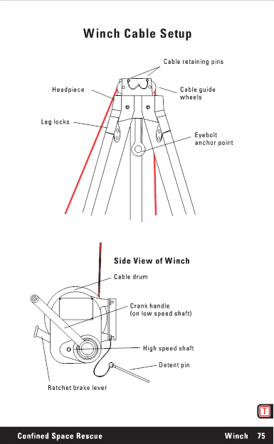 Winch Cable Setup Cable retaining pins Headpiece Cable guide wheels Leg locks Eyebolt anchor point Side View of Winch Cable drum Crank handle (on low speed shaft) High speed shaft Detent pin Ratchet brake lever Confined Space Rescue Winch 75 |