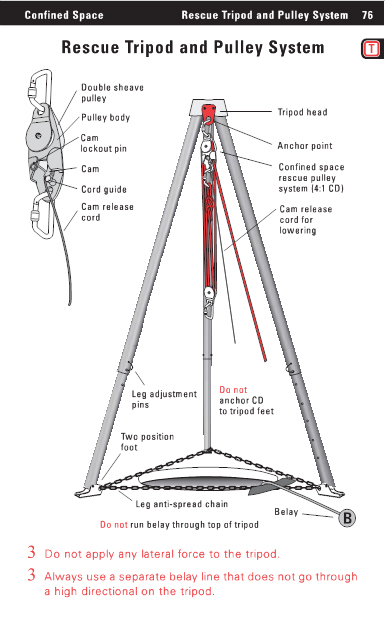 Confined Space Rescue Tripod and Pulley System 76 Rescue Tripod and Pulley System Double sheave pulley Pulley body Cam lockout pin Cam Cord guide Cam release cord Tripod head Anchor point Confined space rescue pulley system (4:1 CD) Cam release cord for lowering Leg adjustment pins Two position foot Do not anchor CD to tripod feet Leg anti-spread chain Belay Do not run belay through top of tripod 3 Do not apply any lateral force to the tripod. 3 Always use a separate belay line that does not go through a high directional on the tripod. |