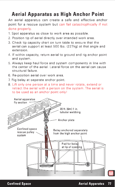 Aerial Apparatus as High Anchor Point An aerial apparatus can create a safe and effective anchor point for a rescue system but can fail catastrophically if not done properly. 1. Spot apparatus as close to work area as possible. 2. Position tip of aerial directly over intended work area. 3. Check tip capacity chart on turn table to ensure that the aerial can support at least 500 lbs. (227kg) at that angle and extension. 4. If within capacity, return aerial to ground and rig anchor point and system. 5. Always keep haul force and system components in line with the center of the aerial. Lateral force on the aerial can cause structural failure. 6. Re-position aerial over work area. 7. Rig belay at separate anchor point. 8. Lift only one person at a time and never rotate, extend or retract the aerial with a person on the system. The aerial is to be used as an anchor point only! Aerial apparatus fly section 20 ft. (6m) 1 in. tubular webbing Anchor plate Confined space rescue pulley system Belay anchored separately from the high anchor point Pad for belay at lip of opening Confined Space Aerial Apparatus 77 |