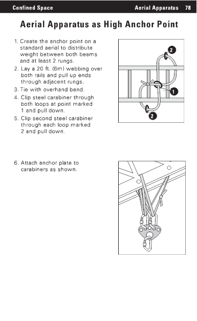Confined Space Aerial Apparatus 78 Aerial Apparatus as High Anchor Point 1. Create the anchor point on a standard aerial to distribute weight between both beams and at least 2 rungs. 2. Lay a 20 ft. (6m) webbing over both rails and pull up ends through adjacent rungs. 3. Tie with overhand bend. 4. Clip steel carabiner through both loops at point marked 1 and pull down. 5. Clip second steel carabiner through each loop marked 2 and pull down. 6. Attach anchor plate to carabiners as shown. |