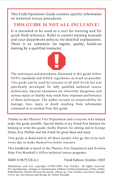 rescue procedures. THIS GUIDE IS NOT ALL INCLUSIVE! It is intended to be used as a tool for training and for quick field reference. Refer to current training manuals and your department policies for detailed explanations. There is no substitute for regular, quality, hands-on training by a qualified instructor. The techniques and procedures illustrated in this guide follow NFPA standards and OSHA regulations as much as possible. This guide can be used by rescuers at all skill levels but was specifically developed for fully qualified technical rescue technicians. Special operations are inherently dangerous and serious injury or fatality may result from improper performance of these techniques. The author accepts no responsibility for damage, loss, injury or death resulting from information contained in or omitted from this guide. Thanks to the Phoenix Fire Department and everyone who helped make this guide possible. Special thanks to my friend Ron Jamison for helping to write this guide, Kathy Darrow for editing and to George Drees, Ken Phillips and Jim Frank for great ideas and input. This guide is dedicated to all those people who go the extra inch every day to make themselves better rescuers. This handbook is based on the Phoenix Fire Department and Arizona State Fire Marshalls Office technical rescue programs. ISBN 0-9675238-4-2 Third Edition October 2003 Illustrations and text copyright c1999-2003 Tom Pendley. All rights reserved. No reproduction, storage or transmission without written permission of the author. Published by Desert Rescue Research. Photos by Tom Pendley and Glenn Speight. Cover art, text layout and design by Glenn Speight. |