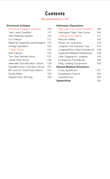 Contents Key procedures in red Structural Collapse Structural Collapse Checklist 116 Task Level Checklist 117 SAR Marking System 119 Cut Station 121 Material Capacities and Weights 123 Airbag Operation 124 T Spot Shore 125 Ellis Clamps 126 Two Post Vertical Shore 127 Laced Post Shore 128 Alternate Door/Window Shore 129 Standard Door / Window Shore 130 60and 45Solid Sole Rakers 131 Flying Raker 134 Sloped Floor Shoring 135 Helicopter Operations Helo Ops Command Checklist 139 Helicopter Flight Risk Score 140 Landing Zone Safety 141 Rescuer Safety 142 Power On Insertions 143 Longline Use Decision Tree 145 Longline/Short Haul Procedures 146 Capewell Release Mechanism 148 Litter Rigging for Longline 149 Emergency Procedures 150 Sling Loading Equipment 150 Rescue Medical Situations Crush Syndrome 151 Suspension Trauma 152 Hypothermia 153 Appendices 154 |
